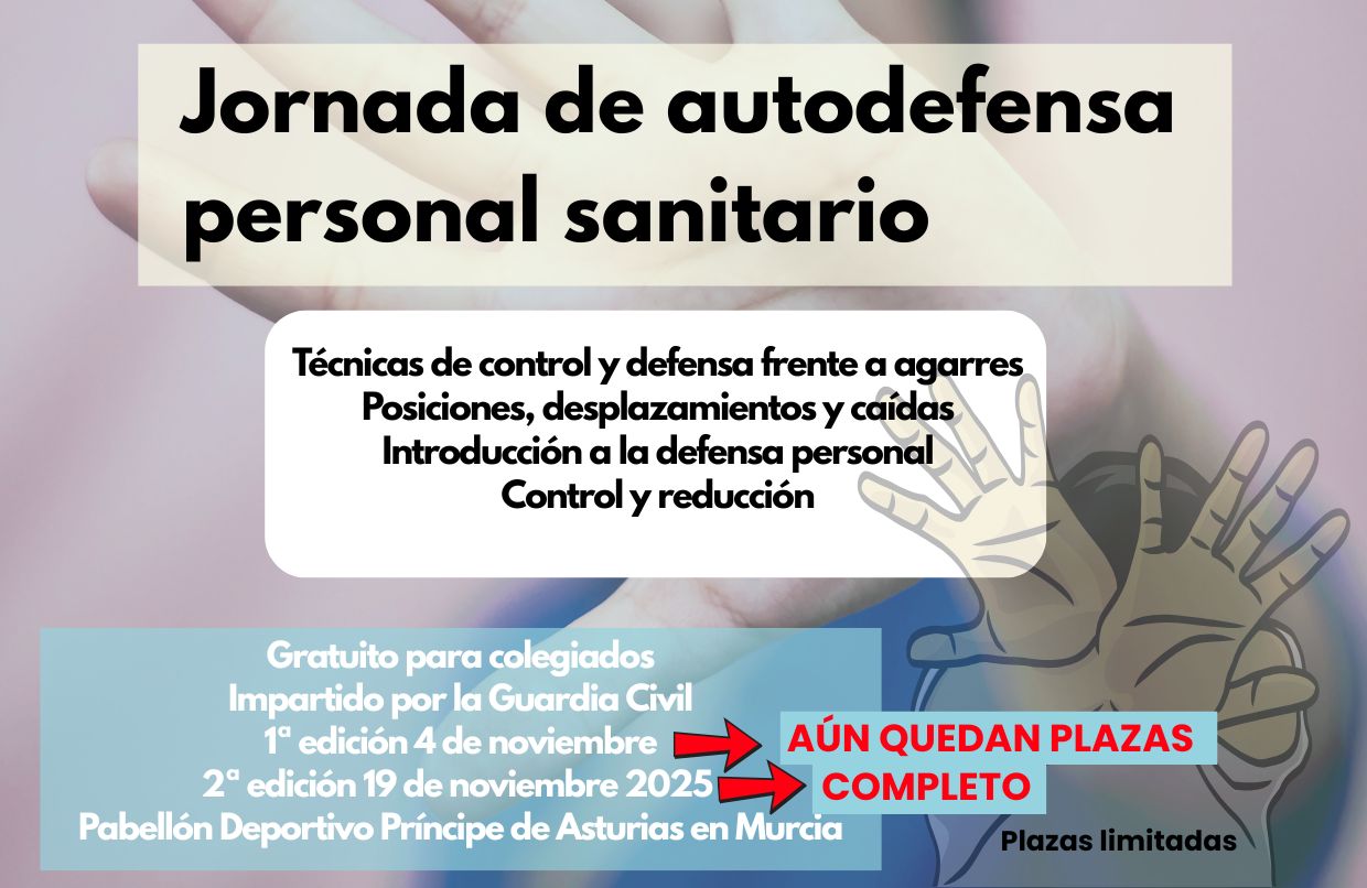 Ya puedes inscribirte a la ‘Jornada de autodefensa personal sanitario’ que será impartida por la Guardia Civil el próximo 4 de noviembre en su 1ª edición y el 19 de noviembre en su 2ª edición en el Pabellón Deportivo Príncipe de Asturias de Murcia. La Jornada es gratuita y está destinada a colegiadas/os con el fin de adquirir conocimientos y técnicas de control y defensa frente a posibles agresiones. Constará de una parte teórica y otra práctica y se impartirá de 8.30 horas hasta las 14.30 horas. Plazas limitadas.