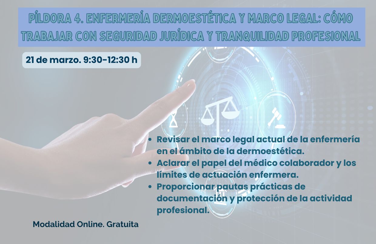 Ya puedes inscribirte a la 4ª Píldora formativa de dermoestética: ‘Enfermería dermoestética y marco legal: cómo trabajar con seguridad jurídica y tranquilidad profesional’. Esta formación, de modalidad online y gratuita,  tendrá lugar el próximo 21 de marzo de 9:30-12:30 h. Con ella, los incritos aquiriran los siguientes conocimientos: