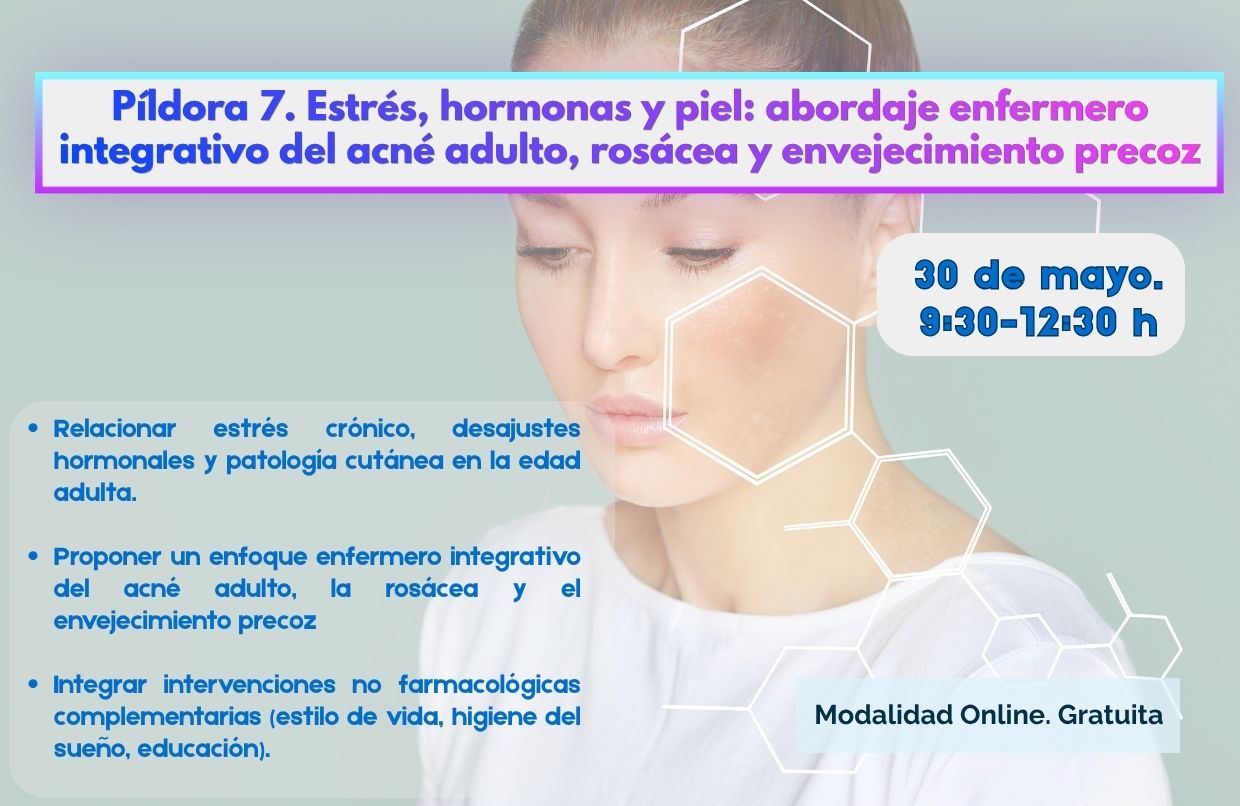 Ya puedes inscribirte a la 7ª Píldora formativa de dermoestética: ‘Estrés, hormonas y piel: abordaje enfermero integrativo del acné adulto, rosácea y envejecimiento precoz’. Esta formación, de modalidad online y gratuita, tendrá lugar el próximo 30 de mayo  de 9:30-12:30 h . Con ella, se darán a conocer los siguientes conocimientos:
