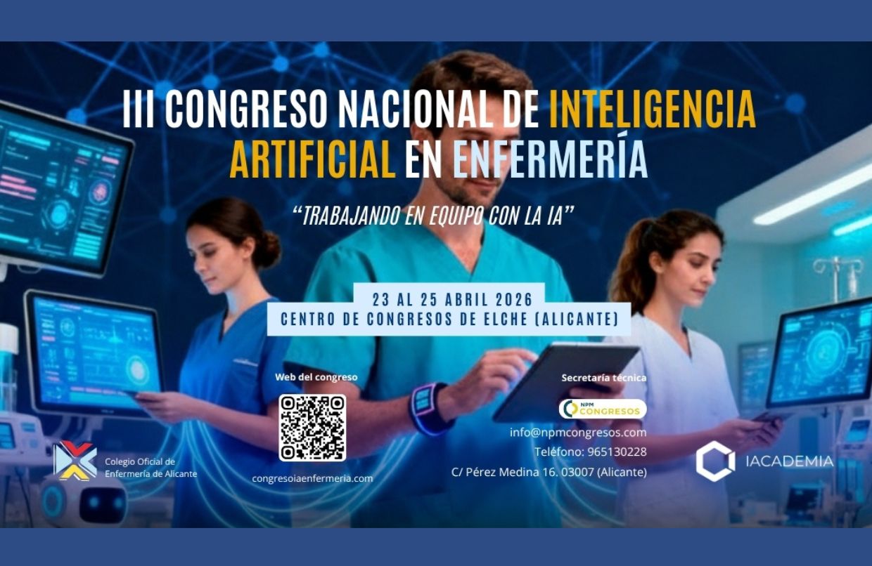 El Colegio de Enfermería de Alicante e IAcademia van a celebrar en Elche la tercera edición del Congreso Nacional de Inteligencia Artificial en Enfermería del 23 al 25 de abril de 2026. Las inscripciones ya han sido abiertas y los colegiados de Murcia pueden acceder al precio reducido de 100 euros, frente a la tarifa general, para las primeras 50 plazas por riguroso orden de inscripción y pago.